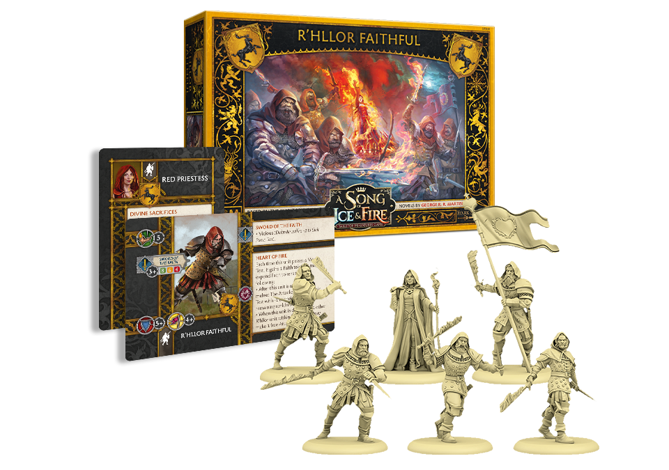 The R'hllor Faithful unit box for the A Song of Ice and Fire: Tabletop Miniatures Game gives House Baratheon players a new, faithful unit to add to their ranks. Their burning blades deal terrible wounds to enemy forces with each slash, going through armor easily. The unit can also gain Faith tokens for passing Morale tests, letting them gain access to new special abilities during the fight. The unit comes with the Red Priestess unit attachment, who can send terror through enemy ranks.