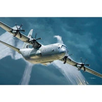 The Lockheed C-130 Hercules is an American medium-range four-engine aircraft. In January 1951, the Tactical Air Command issued a specification for an aircraft intended for tactical transport. It praised a machine capable of carrying 30,000 pounds (13,620 kg) in a theater of operations and 90 soldiers or 72 paratroopers at a range of 2,000 miles (3,380 km). Four companies were invited to design such an aircraft: Boeing, Douglas, Lockheed and Fairchild. Lockheed's L-206 project was the winner. The first serial C-130 was flown on April 7, 1955 at the Dobbins base in Marietta. In the years 1961-1962, the C-130E version was created.