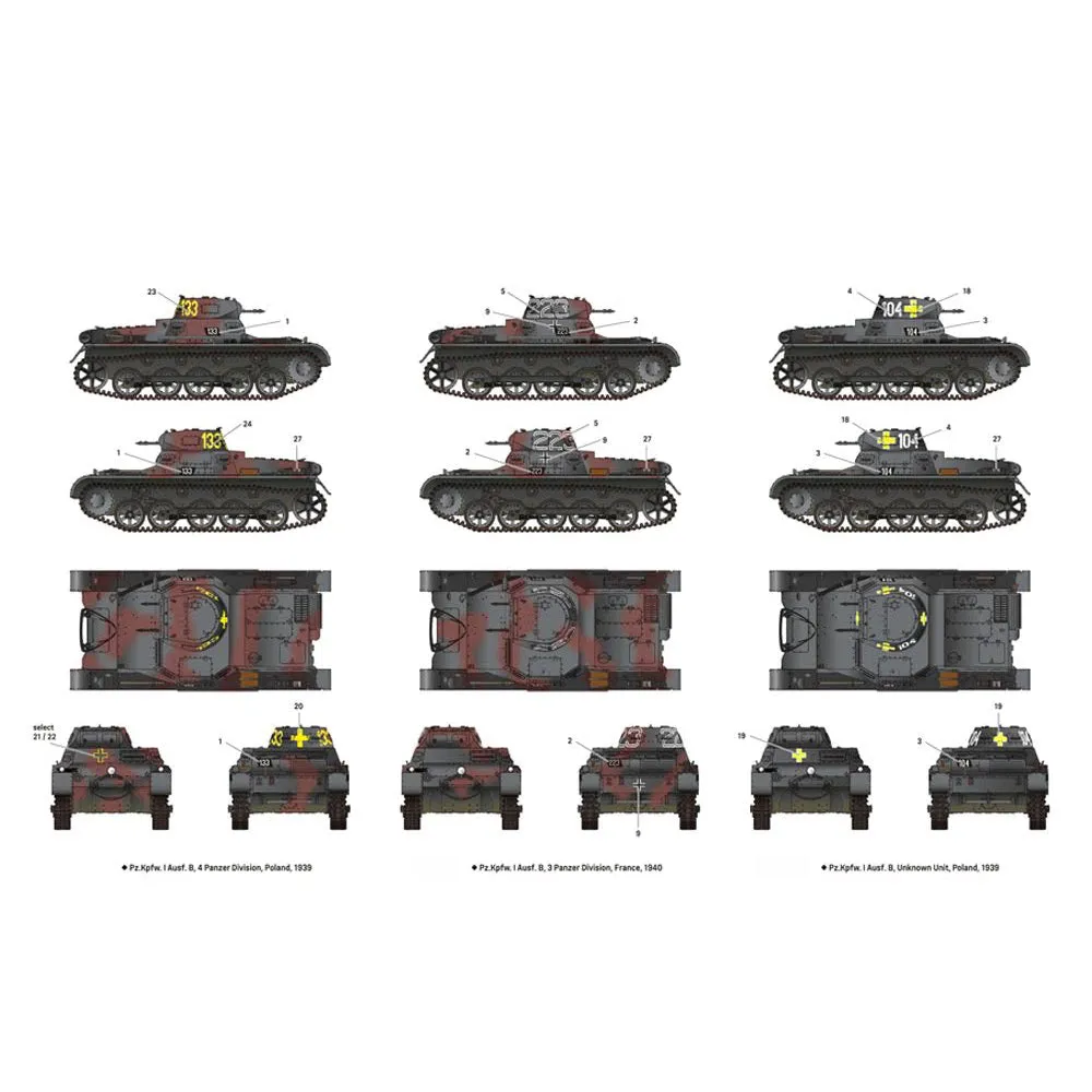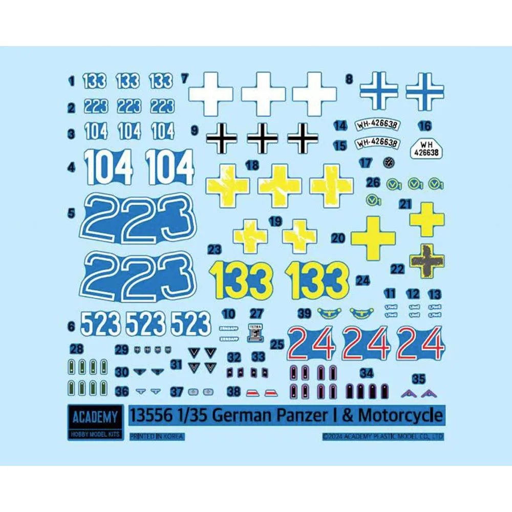 SKU: ACA-13556 | Brand: Academy | Product: Academy 1/35 German Panzer I Ausf.B & Motorcycle Plastic Model Kit This 1/35-scale kit includes components for constructing both the Panzer I Ausf. B light tank and an accompanying motorcycle with sidecar. The Panzer I Ausf. B saw service during early World War II operations, functioning in reconnaissance and infantry support roles. The kit features photo-etched metal components for enhanced realism, an optional open or closed tank hatch, three military figurines, five historically accurate paint schemes representing different operational theaters, and detailed plastic construction for both vehicles.
