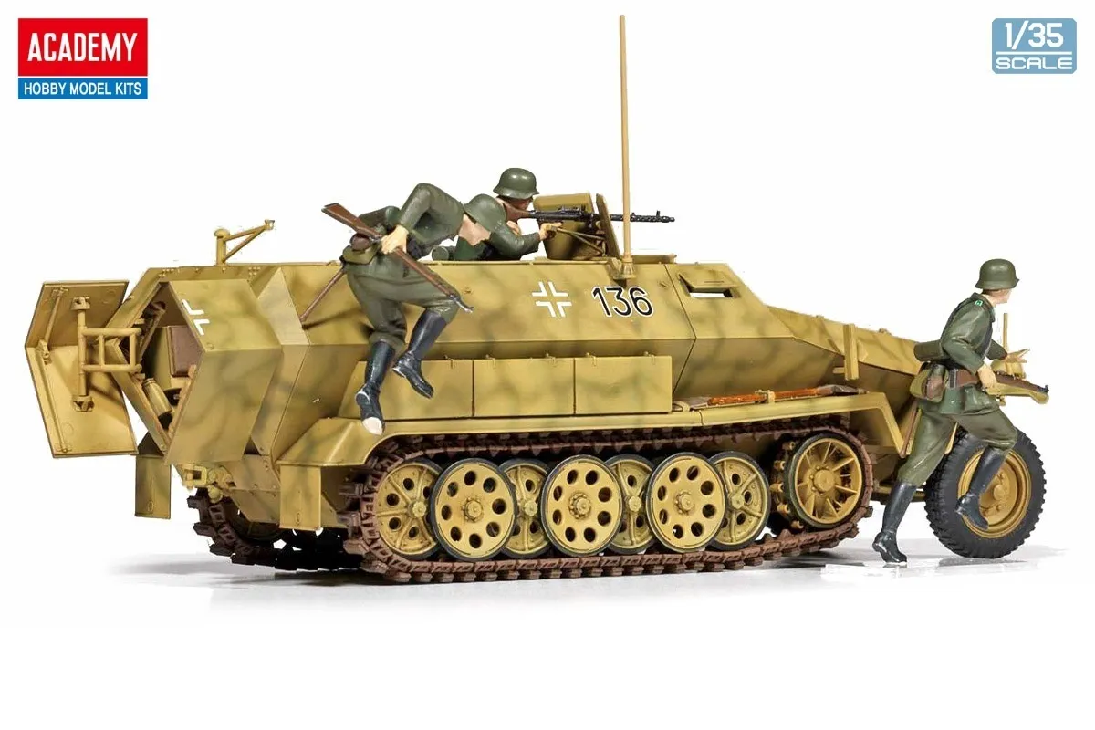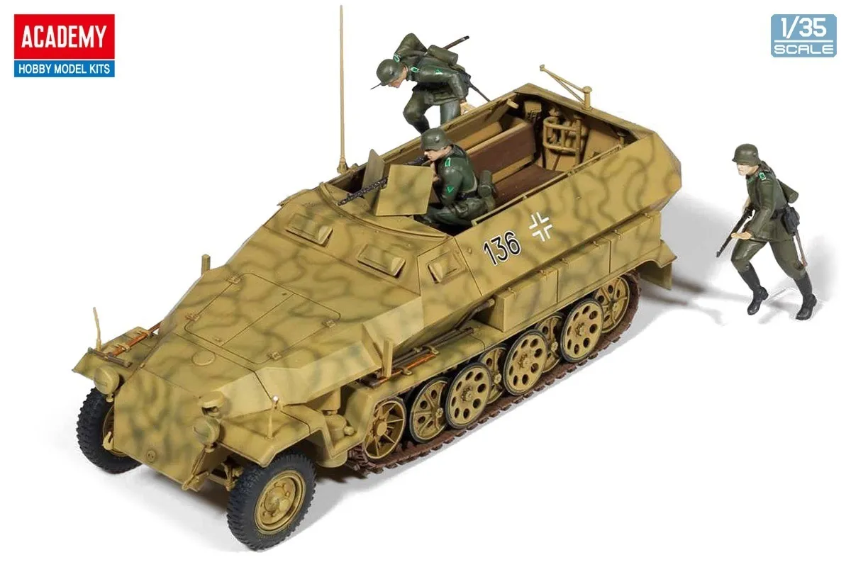 Academy brings us a model kit of the Sd.kfz.251/1 half-track Type C, manufactured by Hanomag and active in the early days of World War II. A moderately limited number of parts makes assembly easy, and its distinctive sharp form is precisely molded. The tracks are a split assembly type; decals for seven versions and three German infantry figures are also included.