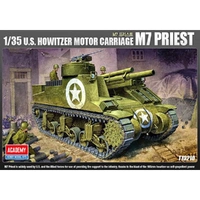 Academy's 1/35 scale M7 Priest contains new tooling, and a whopping 318 parts. The flexible one-piece track, the new movable 105mm Howitzer, and new armor ride on new tooled suspension as well. The finite exterior, transmission & interior drive station detail can be seen on this historically faithful scale model. Both .50 & .30 caliber guns and accessories are included. Academy has given modelers a precise decal set and paint instructions allowing one of four M7 'Priests' to be built. Features - Over 318 parts - Decals to build one of four historical models - Early version modeled with Verticle Volute Spring Suspension (VVSS) - Single, flexible one-piecemolded track for ease of assembly - Moveable 105mm Howitzer