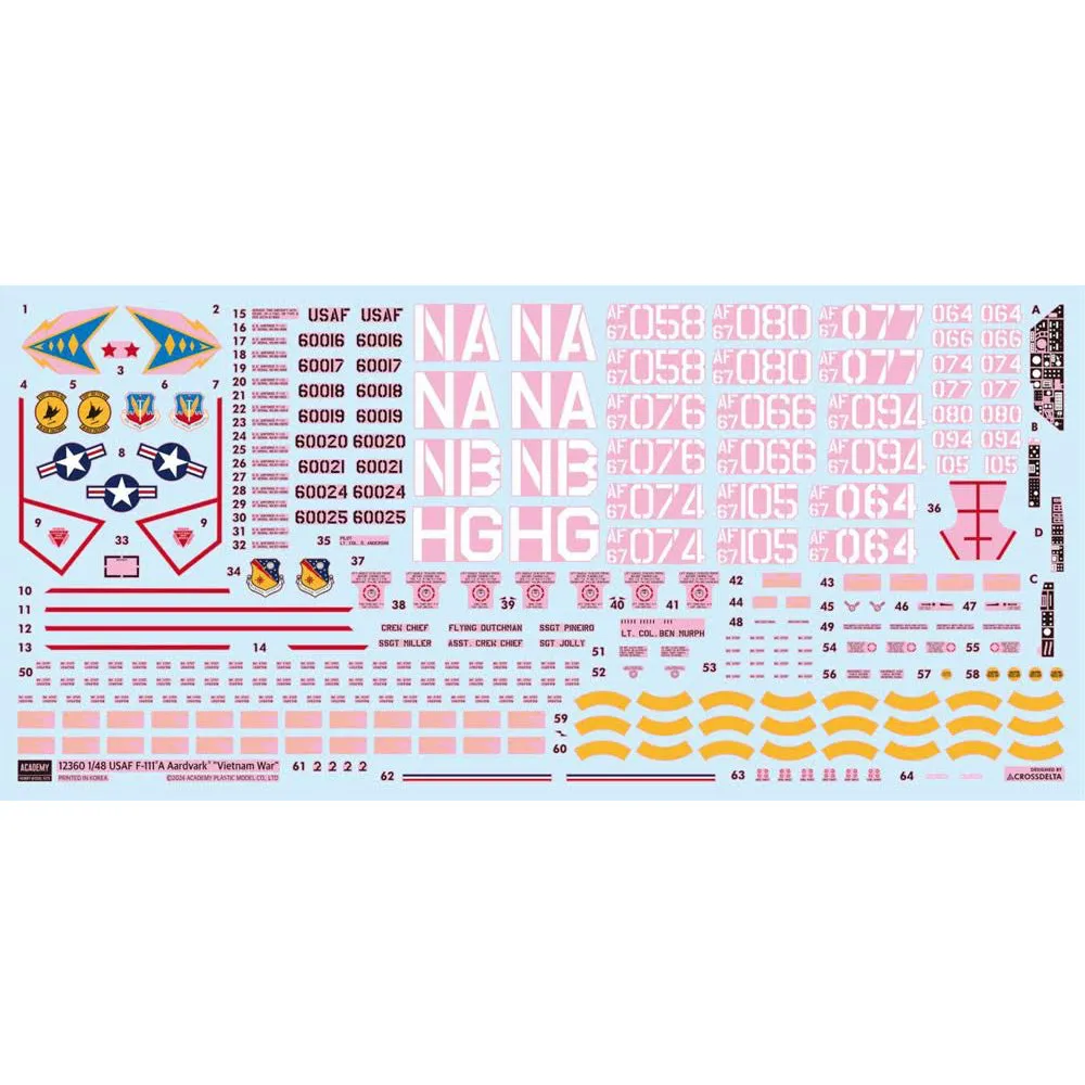 SKU: ACA-12360 | Brand: Academy | Product: Academy 1/48 USAF F-111A Aardvark "Vietnam War" Plastic Model Kit This 1/48 scale representation of the General Dynamics F-111A Aardvark captures the aircraft as deployed during the Vietnam War. The kit comprises seven sprues with enhanced nose gear components, air-to-ground ordnance options, and a metal pitot tube. Four decal options document operational variants: Det 1, 428th TFS, 474th TFW at Takhli RTAFB in 1968 (66-0018, flown by Lt Col Benjamin C Murph); 429th TFS, 474th TFW, Nellis AB in 1971 (67-0058, commanded by Lt Col Robert D Anderson, a MiG-killer from his F-4C service); 3474th TFW at Takhli RTAFB during 1972-73 Operations Constant Guard V and Linebacker II, when these aircraft carried bomb loads exceeding those of F-4 Phantom IIs; and 429/430th TFS under 347th TFW command at Takhli and Korat in 1973-1975, concluding with deactivation in June 1975.