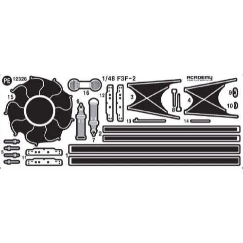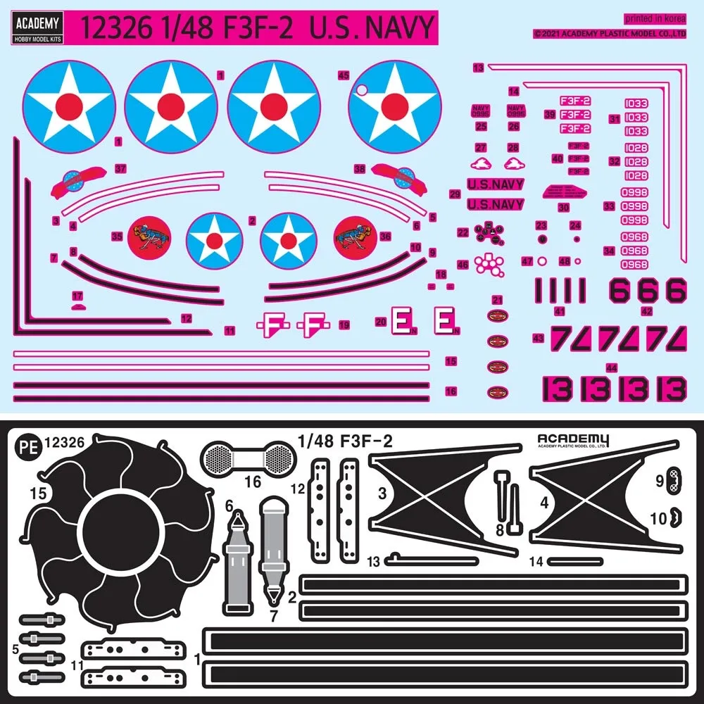 The U.S. Navy’s last biplane in World War Two. Markings for three aircraft: (1) USS Enterprise VF-6 “Fighting Six” 1939. (2) USS Wasp VF-7 “The Blue Burglars” 1939. (3) USN Institute fighter-trainer BuNo0995 1942. Photo-etch parts. 1:48 scale plastic model kit from Academy, requires paint and glue.