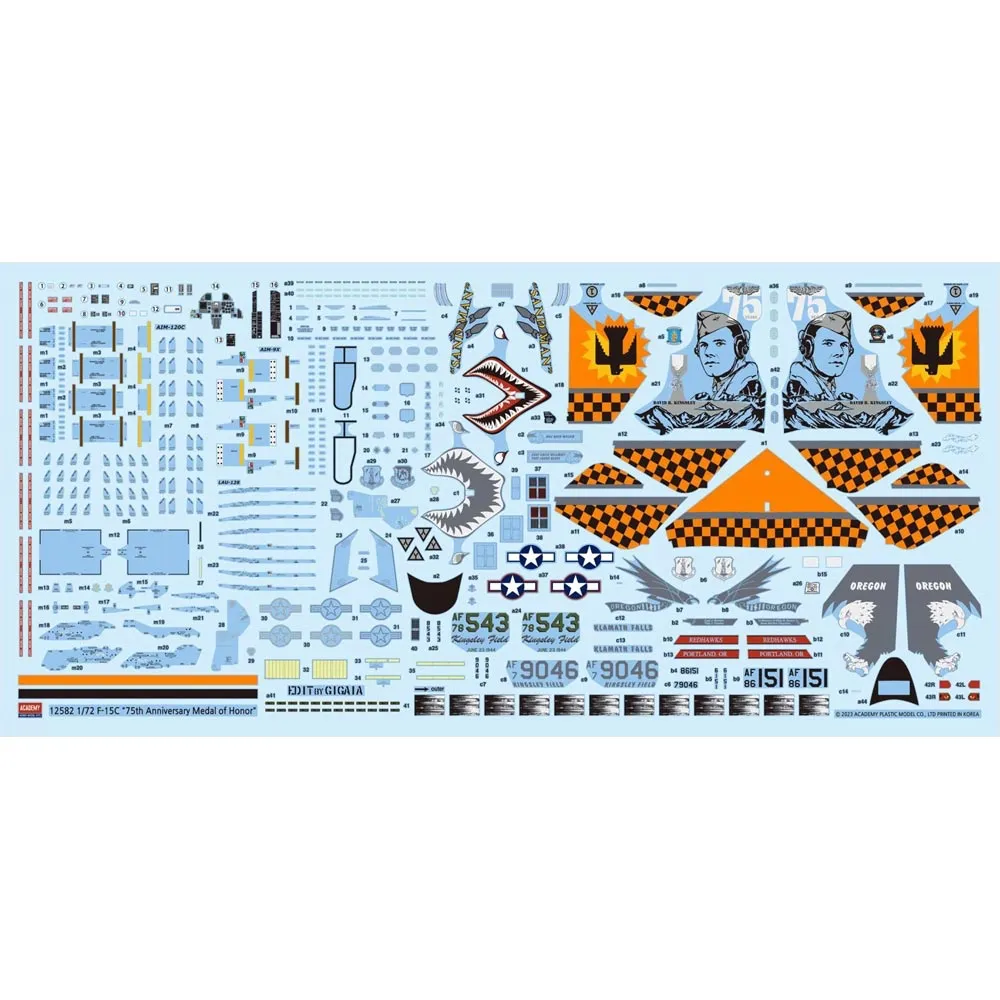 Detailed exhaust nozzles (“turkey feathers”), optional position air intake ramps and canopy, additional new parts including AIM-9X & AIM-120C air-to-air missiles. Comprehensive decal sheet with choice of 3 markings: (1) F-15C 78-0543, USAF 114th FS/173rd FW Oregon ANG, 2020 shown on the box top; (2) F-15C 86-0151, USAF 123rd FS/142nd FW Oregon ANG, 2021; (3) F-15C 79-0046, USAF 114th FS/173rd FW Oregon ANG, 2015.