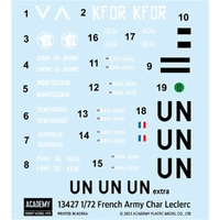 French Army Char Leclerc, late 1990s. The first main battle tank independently designed by France. Reboxed Ace Corporation kit. 4 sprues. 120mm CN120-26/52 main gun & 7.62mm AAT-52 NF1 machine gun. Choice of 5 markings: (1, 2, 3) Task Force Leclerc, KFOR, Kosovo, 1999; (4, 5) Leclerc T5, France. 1:72 scale plastic model kit from Academy, requires paint and glue.
