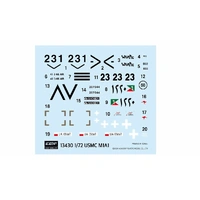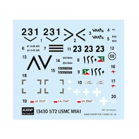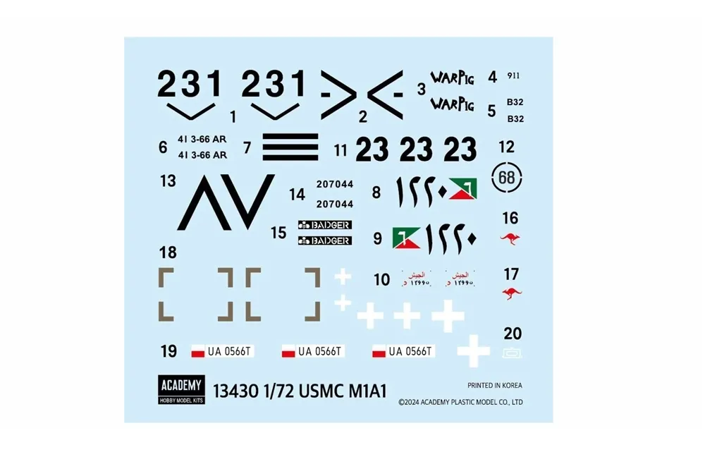 Reboxed Ace Corporation kit. 4 sprues including semi-connected tracks. 120mm M256A1 main gun, 12.7mm M2HB machine gun. Choice of 5 markings: (1) M1A1, USMC C Company, 1st Tank Battalion, Iraq 2003; (2) M1A1, US Army B Company, 3rd Tank Battalion, 66th Armor Regiment, Iraq 2003; (3) M1A1, Egyptian Army, Cairo Egypt 2011; (4) M1A1 Australian Army, B Squadron, 3 Troop, 1st Armoured Regiment, 2015; (5) M1A1, Poland 2023.