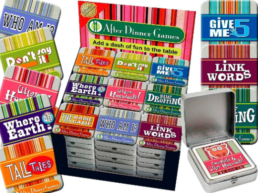 A great way to round off a convivial meal is with a game or two. Our After Dinner Tins include popular forms of games where little is needed other than four or more enthusiastic players and a scrap of paper to keep score. Each tin holds 50+ questions or challenges, printed on cue cards so they are easier to pass over the cheeseboard, and likely to cause much conversation and laughter around the table. Our selection of games includes Utter Hogwash, Humm Bug, Wild Guess, Where on Earth, Dont Say It, Who Am I, Would You Could You and Name Dropping - order more than one to receive a selection.