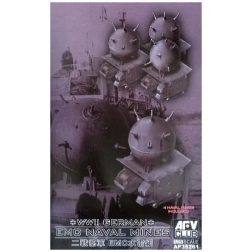 SKU: AFV-35261 | Brand: AFV Club | Product: AFV Club 1/35 Germany EMC type II mines Plastic Model Kit [AF35261] 1/35 scale representation of German EMC Type II naval mines. This plastic model kit provides components for four separate mines. Included materials: photo-etched detail sheets, black thread, and waterslide decals. Assembly required. Paints and adhesives sold separately.