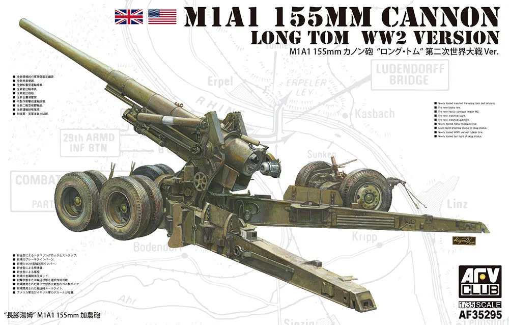M1A1 155mm Long Tom Cannon (WW2 version). _x000D_ Many new tooled parts including M2 limber, travelling lock & lanyard, sight & gun bolt, new rubber tyres 1:35 scale plastic model kit from AFV Club, requires paint and glue