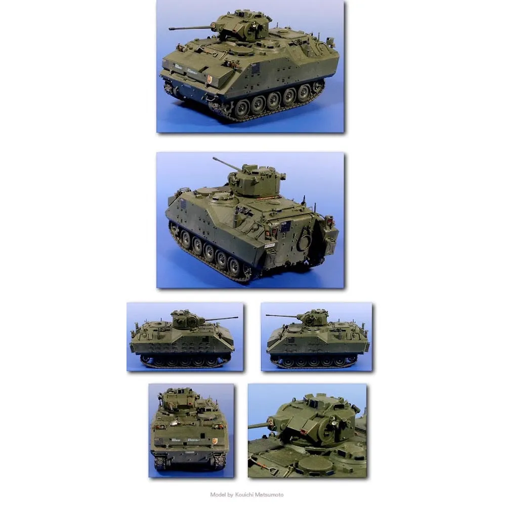 The AIFV (Armored Infantry Combat Vehicle), also known to the Dutch Army as YRP-765, was originally developed as the successor to the world best-selling M113 APC, in late 1970's. It has a 25mm cannon in the small turret, and improved armor. As far as combat capability, the AIFV is inferior to the more modern powerful ICVs (Infantry Combat Vehicle) which are equipped with larger cannon and Anti-tank missiles, like the M2A2 Bradley and the BMP-3. But its reasonable procurement cost is very attractive to the Armies of small countries. Features - AFV Club offers this interim AFV design in a high quality kit. - The kit is thoroughly detailed and parts are molded very sharply. - A photo-etchd set for engine grilles and fuel can racks are included, too. - Tracks (rubber belt type), drive sprocket and idler wheels are US standard. - Decals are for Armies of Belgium, Turkey (UN Roll) and the Philippines (thus the kit is named NATO IFV).