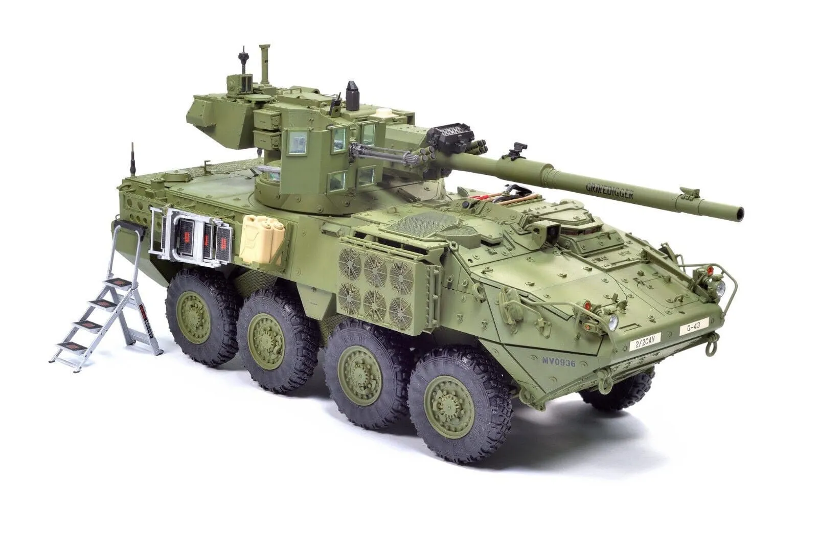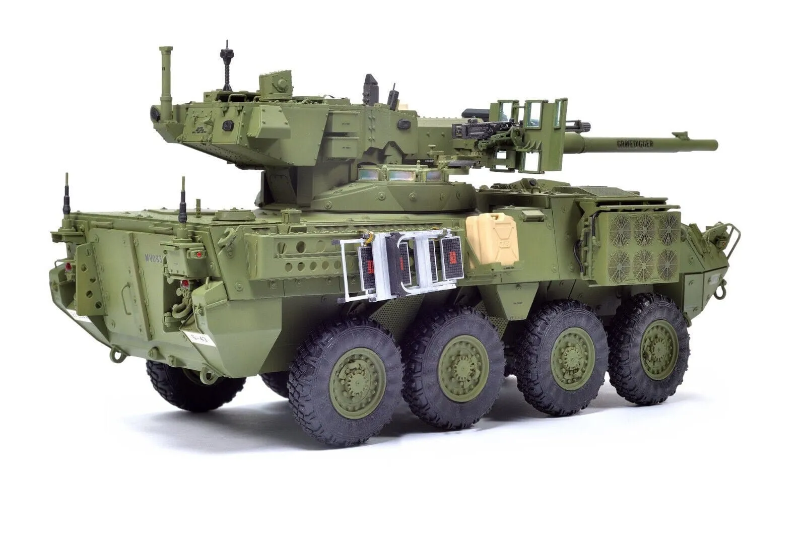 SKU: AFV-35370 | Brand: AFV Club | Product: AFV Club 1/35 Stryker M1128 MGS "2010" Upgraded Version Plastic Model Kit [AF35370] AFV Club's 1/35 scale Stryker M1128 MGS 2010 Upgraded Version represents a modern American wheeled armoured vehicle. Development began around 2000 with prototype testing, followed by production starting in 2002. By early 2018, approximately 4,900 units had been manufactured. The vehicle is equipped with a Caterpillar C7 engine generating 350 horsepower. The M1128 variant carries different armament configurations; the base M1126 model mounts either dual 7.62mm machine guns or a Mk.19 grenade launcher paired with a 7.62mm machine gun. The Stryker platform emerged from US Army requirements for rapid global deployment capability, prioritizing speed, mobility, and strategic force projection to achieve Light Infantry Brigade deployment within 96 hours worldwide.