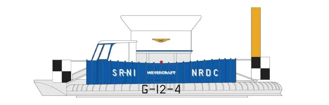 The SR-N1 Hovercraft is supported on a cushion of air and operates at heights just sufficient to clear waves and surface irregularities on land.