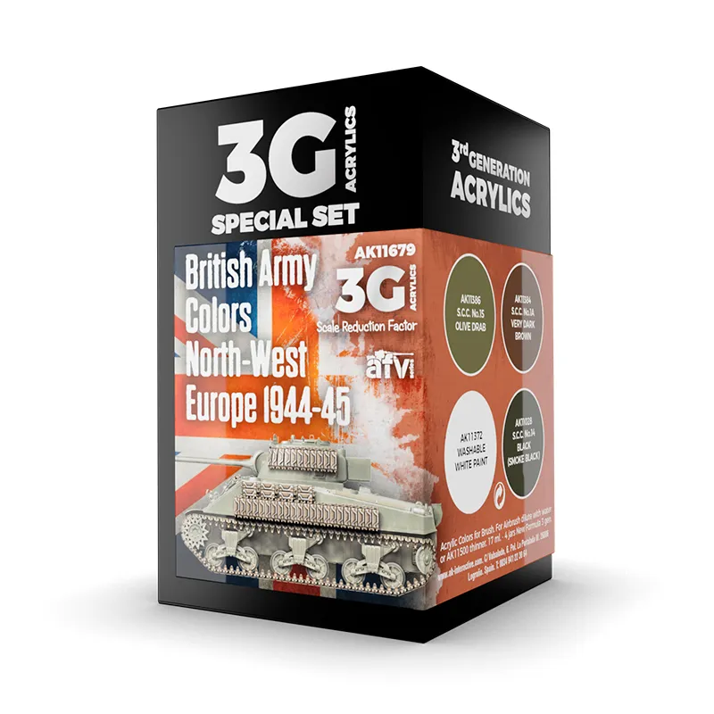 A special set of 3rd Generation acrylic paints including the four camouflage colors that were most commonly used for painting vehicles of British and Commonwealth forces deployed in the North-West Europe from 1944 until the end of World War II.