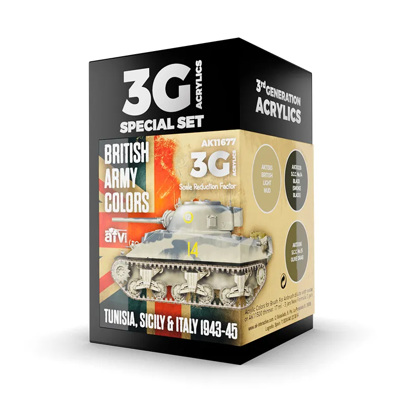 A special set of 3rd Generation acrylic paints including the three camouflage colors that were most commonly used for painting vehicles of British and Commonwealth forces deployed in Tunisia, Sicily and Italy from April 1943 (S.C.C. No.15 Olive Drab was introduced one year later) until the end of World War II.