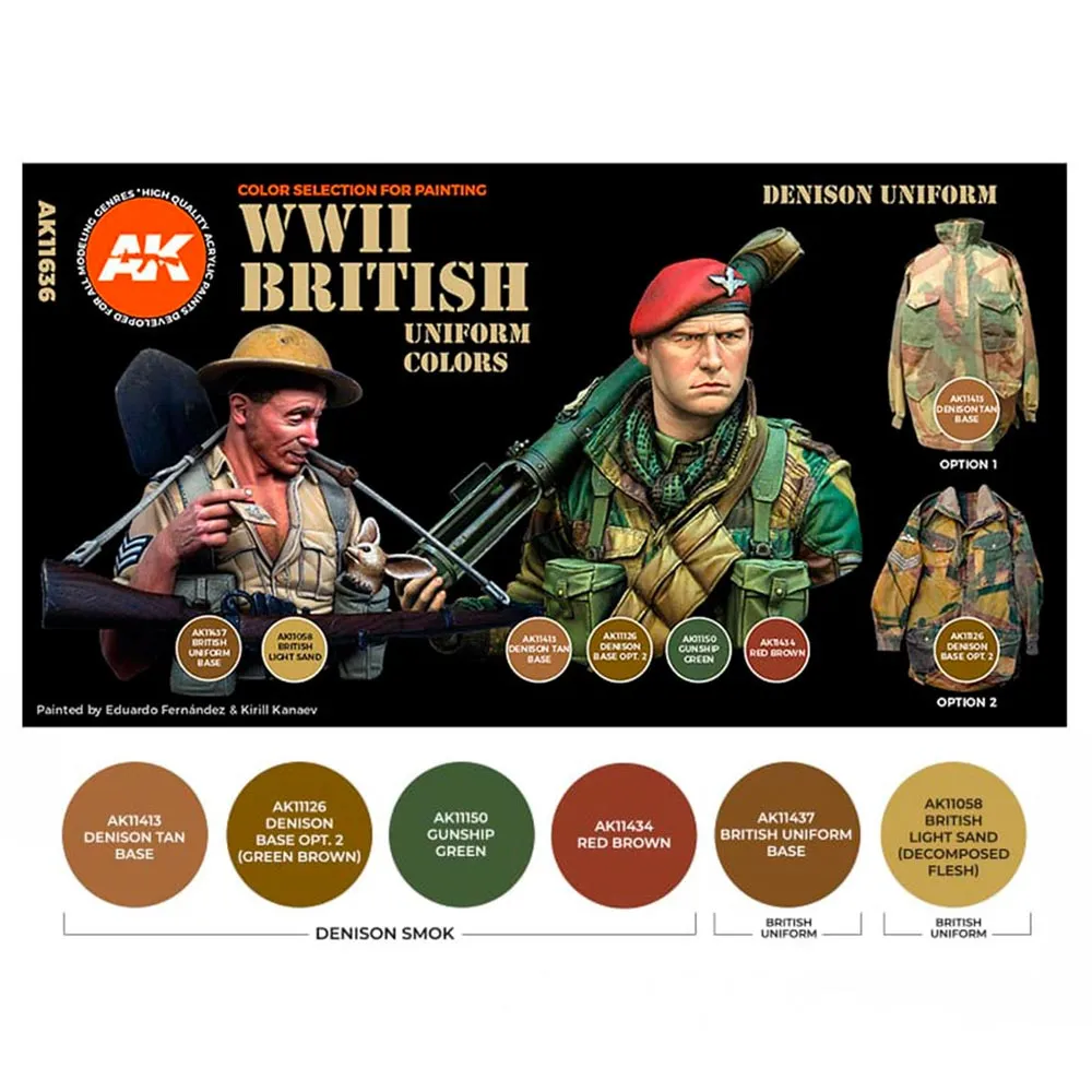 In this set you will find all the necessary colors to paint all the monocromatic uniforms used by the British ground forces and all the camouflage patterns used at the time, such as the Denison pattern.