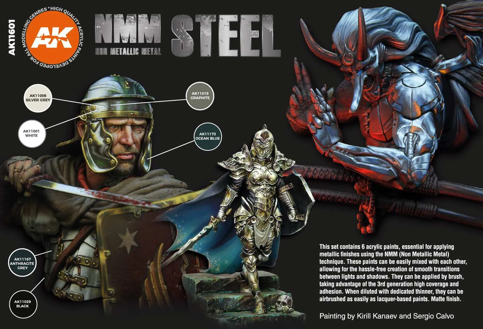 This set contains 6 acrylic paints, essential for applying metallic finishes using the NMM (Non Metallic Metal) technique. These paints can be easily mixed with each other, allowing for the hassle-free creation of smooth transitions between lights and shadows. They can be applied by brush, taking advantage of the 3rd generation high coverage and adhesion. Diluted can be airbrushed as easily as lacquer-based paints.