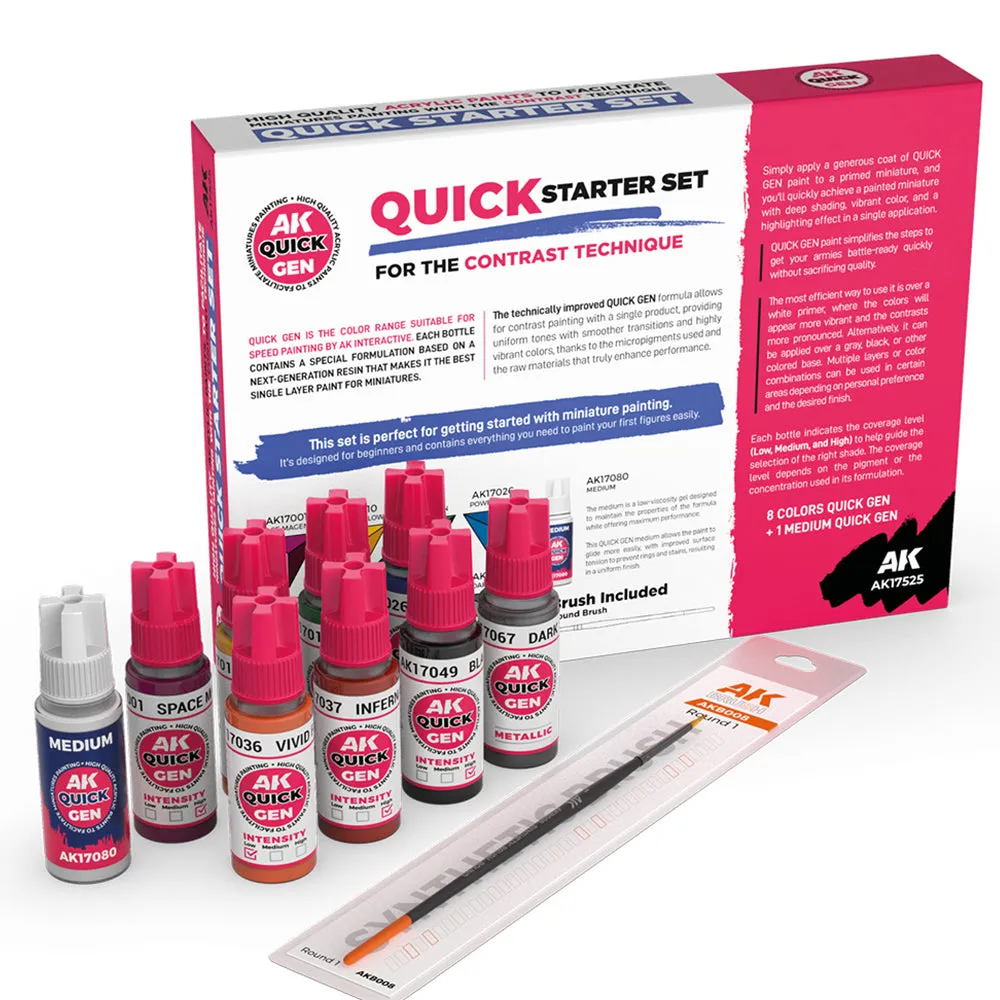 Inside you'll find 8 QUICK GEN paints, 1 MEDIUM QUICK GEN (AK17080), and 1 FREE brush.
