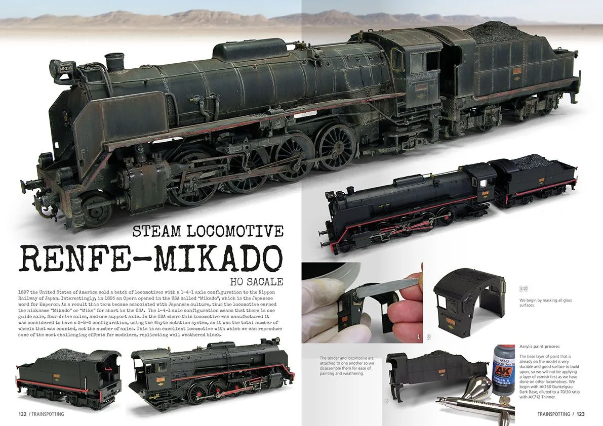 208 pages If trains and railway modelling are your passion or you just love quality scale modelling you can’t miss this book with the usual AK’s quality display plus Marklin’s input. A handbook that will possibly become a cult book for scale railway modelers in the next years. A new approach for an instructional book and the for the way techniques are displayed to beginners and advanced modellers. The book is structured in three main blocks. The first part contains the different techniques and materials we have at our disposal in order to be able to represent as many different effects as it is necessary. The second block walks us through a greatly visual and detailed description of the different processes and materials involved in representing these effects on different types of locomotives and wagons. A variety of techniques and work carried out by some of the best European and American modellers. On the third section we will see how to weather railway buildings and rail station structures and their elements. This goes together with a chapter full of real reference pictures of trains from around the world that will really delight the reader and push many to start with the hobby.