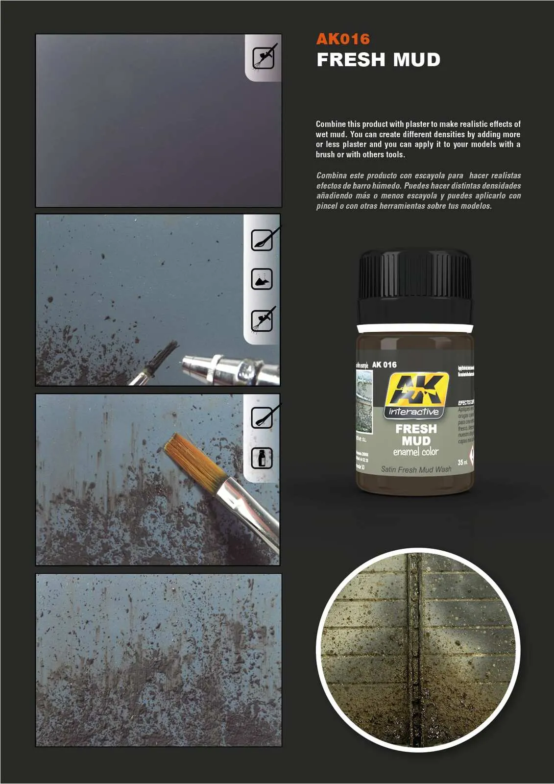 A product to replicate natural fresh mud. This Dark brown enamel effect is ideally suited for creating muddy surfaces. It can be also mix with plaster to create volume. Apply with a brush or airbrush and then fade with a clean brush moist with Enamel Thinner. Just apply to your vehicle wheels, tracks and hull to achieve the most realistic effect.