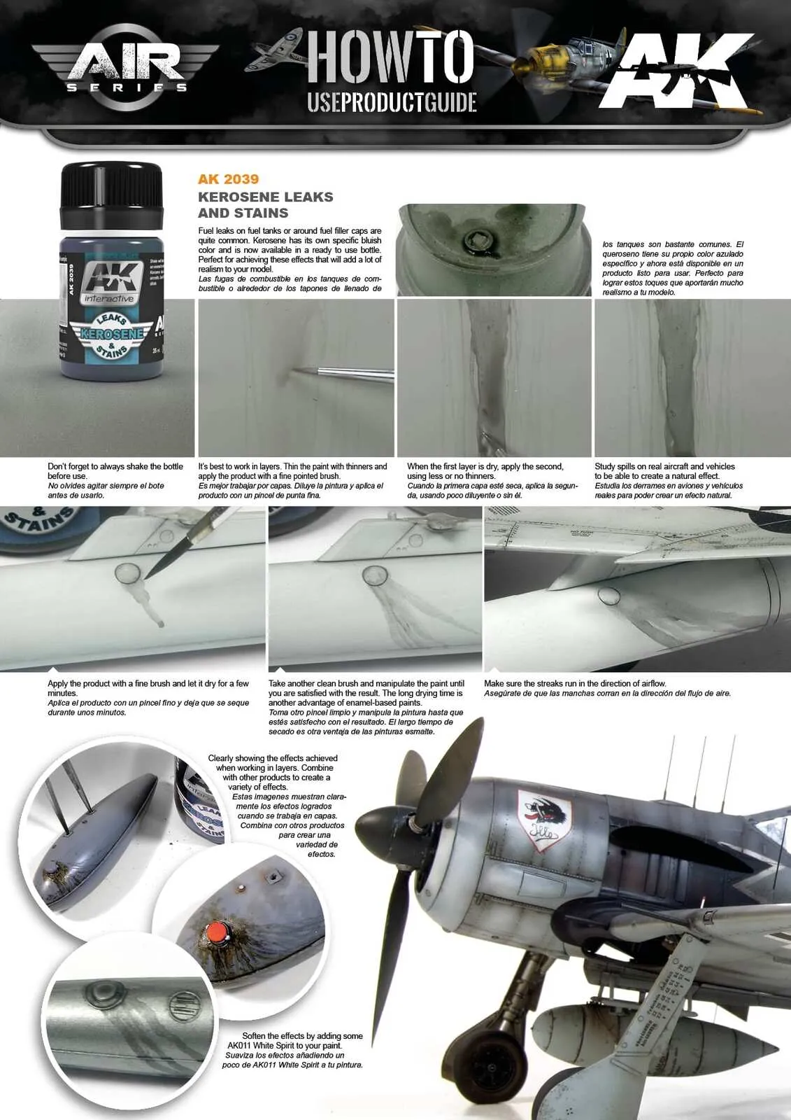 Enamel Product.   The definitive mixture to make kerosene spilled effects in any type of modern or classic aircrafts. This is not product to make oil and grease effects. This product is good mainly to make kerosene spilled effects only with a great realism. This product is enamel and it can be blended with the rest of our colors and it is diluted with our White Spirit.