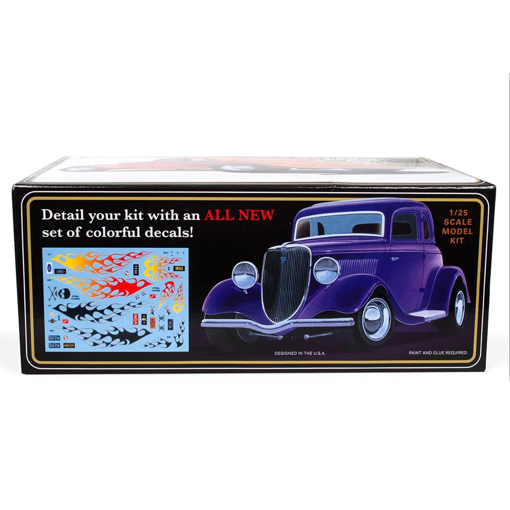 1934 Ford Street Rod 5-Window Coupe. DETAILED ATTITUDE: The 1934 Ford 5-Window Coupe is a cool build for classic hot rod modelers! Fully paintable, it includes an EXPANDED water-slide decal sheet with colourful options and dashboard gauges. Build it up right with these authentic features: small block Chevy engine, custom wheels, and tires, detailed interior, steerable front wheels, optional taillights, and more. Wrapped up nicely in ALL NEW vintage-style packaging that really pops! Features: