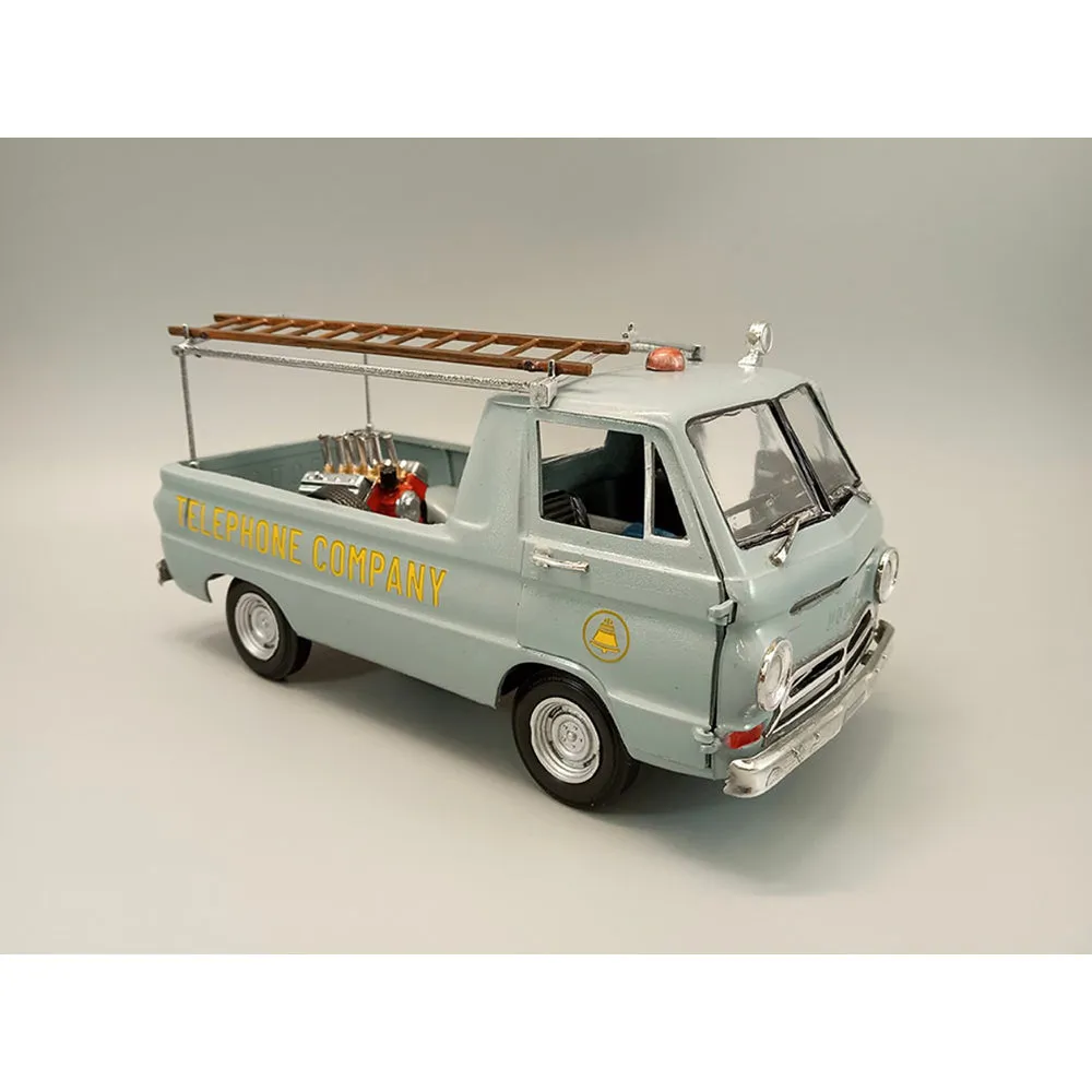 1966 Dodge A100 Pickup "Touch Tone Terror". This 1966 Dodge A100 Pickup provides plenty of options to create various pick-up trucks including a 426 Hemi drag truck, a stock pick-up, a telephone utility truck, or the Frisco Sleeper. This kit comes with tons of goodies including a 426 engine, stock 273 cu. in. V8 engine, opening doors, an opening tailgate with a drag chute, a wheelie display stand, a utility rack, an extension ladder, custom mag wheels, a set of Goodyear vinyl drags, and a set of full-colour water-slide decals. It also contains a BONUS full-colour cardboard telephone booth, a Frisco Sleeper canopy, and a tent. Features: