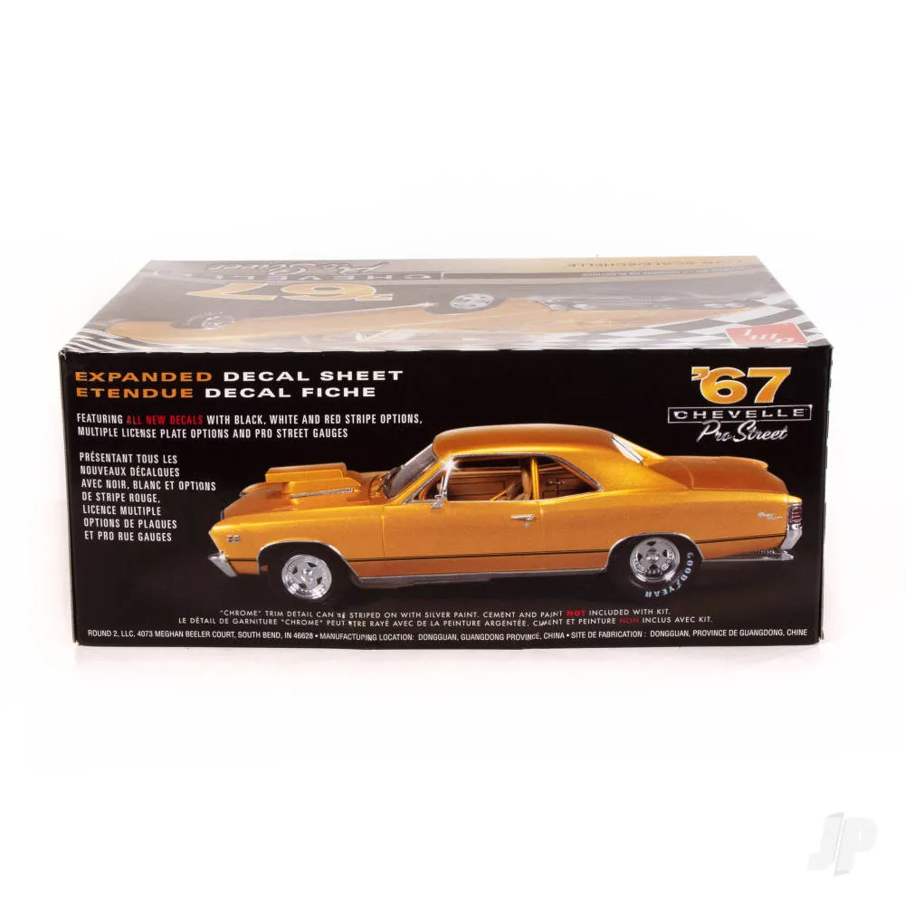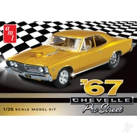 1:25 1967 Chevy Chevelle Pro Street AMT's Pro Street Chevelle is as much at home on the strip as it is on the street. With motor intake, hood scoop and tire options, this super-detailed kit will satisfy any Pro Street or drag racing enthusiast! Scale: 1:25 Skill Level: 2 (ages 10 and up) Glue assembly, paint required Super-detailed motor, suspension and interior Optional motor intake options Optional hood scoop Two sets of rear tires included treaded pro street and pad-printed drag racing Many chrome plated accessories Colourful decal sheet
