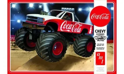1:25 1988 Chevy Silverado Monster Truck (Coca-Cola) Features: 1:25 scale, skill 2, paint, and cement required Molded-in white, the modeler’s choice High-rise monster truck suspension Custom supercharged Chevy engine Rollbar with lights Removable hood Huge vinyl monster truck tires Authentic Coca-Cola decal Graphics Stylized collectible Coke oversized packaging