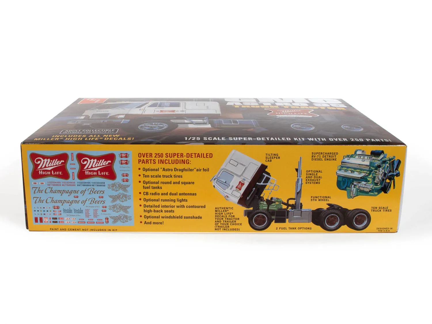 BIG ON DETAIL: Loaded with features, the GMC General 95 includes: 2 large chrome trees, Detroit Diesel 8V-71 engine, tilting hood, optional single and dual chrome exhaust systems, optional “Astro Dragfoiler” air foil, detailed interior and more! Fully paintable, with ALL NEW Miller High Life water-slide decals and vintage-style packaging which will WOW your friends