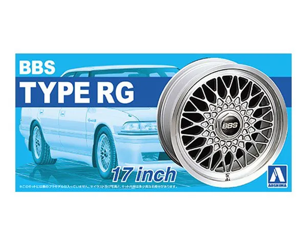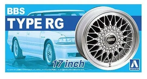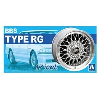 This 1/24-scale Aoshima BBS RG 17-inch wheel set consists of detailed plastic components. The kit provides accurate reproduction suitable for automotive model assembly and display applications.