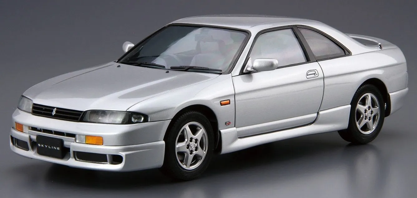 SKU: A006212 | Brand: Aoshima | Product: Aoshima 1/24 Nissan ECR33 Skyline GTS25T TypeM '94 Plastic Model Kit This 1/24 scale model documents the ECR33 Skyline GTS25T Type M, representing the R33 series full redesign introduced in August 1993 and colloquially known as GT9. Engineered as a grand touring platform, the R33 built upon R32 foundations with refined weight distribution and expanded cabin volume. The kit renders the ECR33 in standard catalogue trim, furnished with aftermarket aluminium wheels and sports muffler. Window masking seals and aero kit pieces facilitate efficient construction. Molded components in white, black, clear and silver with chrome-plated accents, complete window masks and decal sheet included.