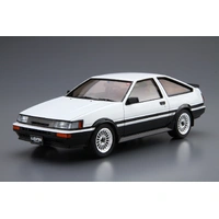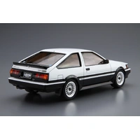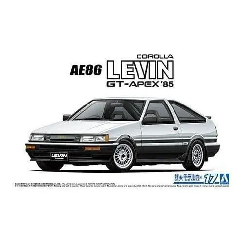 SKU: A006192 | Brand: Aoshima | Product: Aoshima 1/24 Toyota AE86 Corolla Levin GT-Apex '85 Plastic Model Kit Introduced in March 1983, the AE86 Corolla Levin pioneered an FR layout when front-wheel drive dominated the market. It employed a newly engineered twin cam 16-valve 4A-G engine, upgrading from the earlier 2T-G. Both the Corolla Levin and its Sprinter Trueno counterpart offered 3-door hatchback and 2-door coupe configurations, with engine type determining designation—AE86 for the 4A-G and AE85 for the 1500 cc 3A-U. The 1985 refresh brought restyled front and rear bumpers, updated rear combination light and new interior colours. This model captures the sought-after "Hachiroku" character from the later iteration, outfitted with factory-option components including Intra aluminium wheels, mud flap, side step and rear spoiler. Requires assembly; cement and paint sold separately.