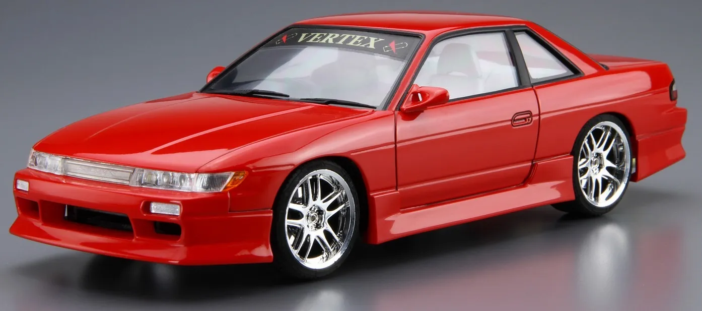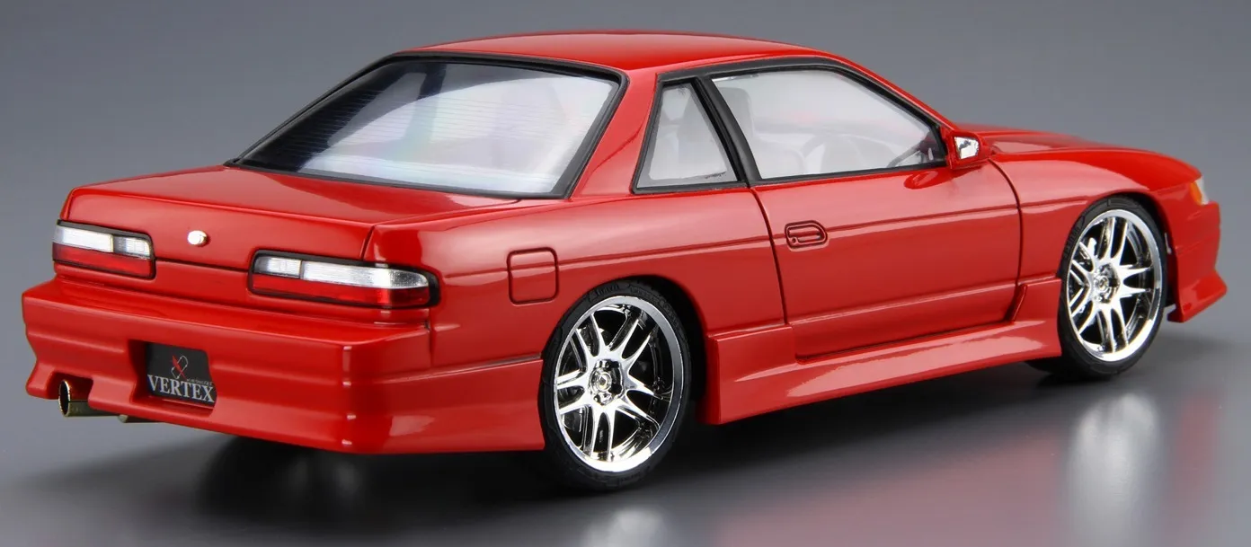 This 1/24-scalemodel kit of the VERTEX PS13 Nissan Silvia from 1991 includes the full aero treatment! Features - Full aero specs for VERTEX - Aftermarket wheels included - Window frame masking stickers included