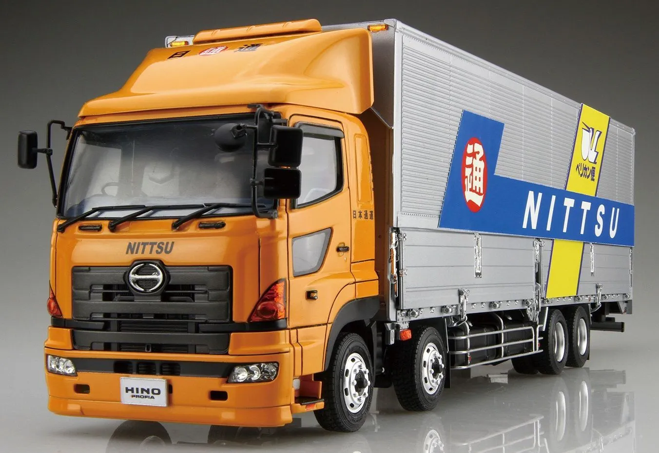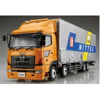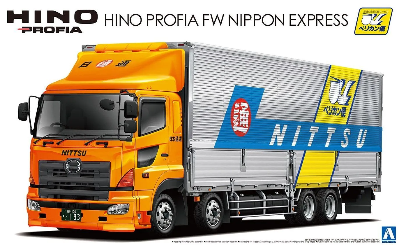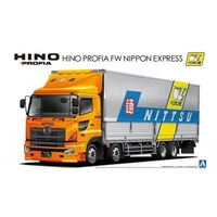This is a Aoshima 1/32 Hino Profia FW Nippon Express Plastic Model Kit Aoshima's highly detailed kit of the Hino Profia FW semi tractor-trailer comes with brand-new silkscreened decals for Japan's famous Nippon Express Pelican Delivery service.