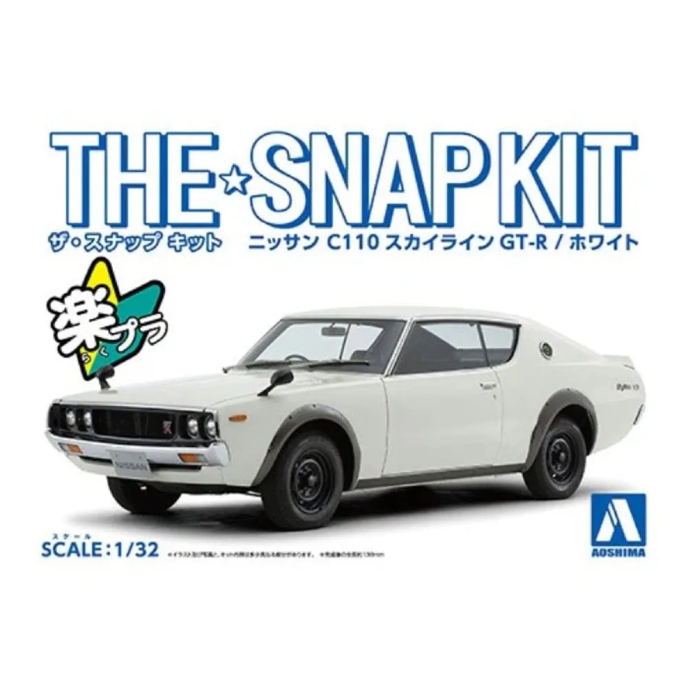 SKU: A006465 | Brand: Aoshima | Product: Aoshima 1/32 Nissan C110 Skyline GT-R (White) Plastic Model Kit Aoshima's 1/32 SNAP kit reproduces the second-generation "Kenmeri GT-R" in white using 25 parts. Optional components allow assembly of a lowered specification variant. The pre-moulded body colour eliminates painting needs, and the glossy finish provides visual depth. Glue-free snap-fit assembly keeps construction simple. At 1/32 scale, dimensions measure 15.24 x 11.43 x 6.35 cm. This SNAP KIT No.18-B offers affordable pricing with minimal assembly complexity.