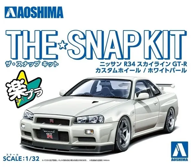 SKU: A006632 | Brand: Aoshima | Product: Aoshima 1/32 NISSAN R34 SKYLINE GT-R CUSTOM WHEEL(WHITE PEARL) Plastic Model Kit This 1/32-scale SNAP KIT series model (No.11-SP3) features the Nissan R34 Skyline GT-R with an 18-inch custom wheel and tyre package. The White Pearl body combines with silver wheels for a refined finish. With 29 total parts, assembly requires no paint or adhesive thanks to the snap-fit construction method. Body colour comes from pre-coloured plastic with glossy finish. A lowered suspension configuration is available as a construction option.