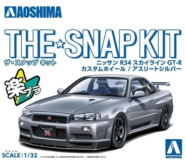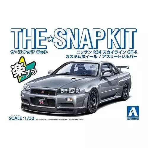 SKU: A006633 | Brand: Aoshima | Product: Aoshima 1/32 NISSAN R34 SKYLINE GT-R CUSTOM WHEEL(ATHLETE SILVER) Plastic Model Kit This 1/32-scale SNAP KIT series model (No.11-SP4) presents the Nissan R34 Skyline GT-R with an 18-inch wheel and tyre configuration. The Athlete Silver body pairs with black wheels for a distinctive appearance. The 29-part kit assembles without paint or glue using snap-fit connections. Pre-coloured plastic delivers the body colour with a glossy finish. A lowered suspension setup can be selected during construction.