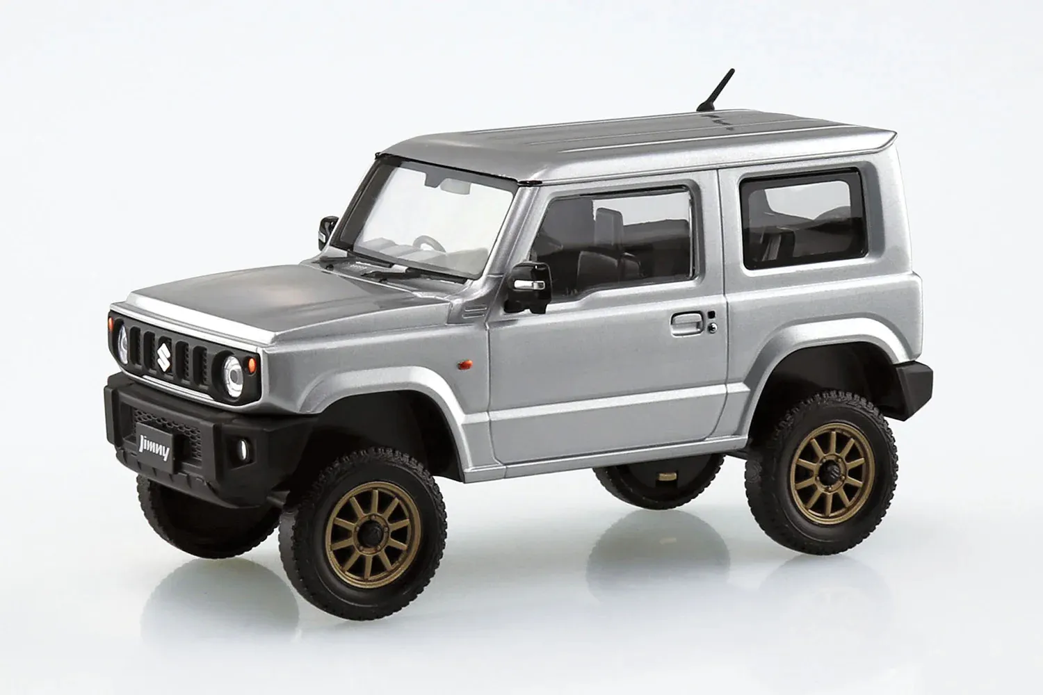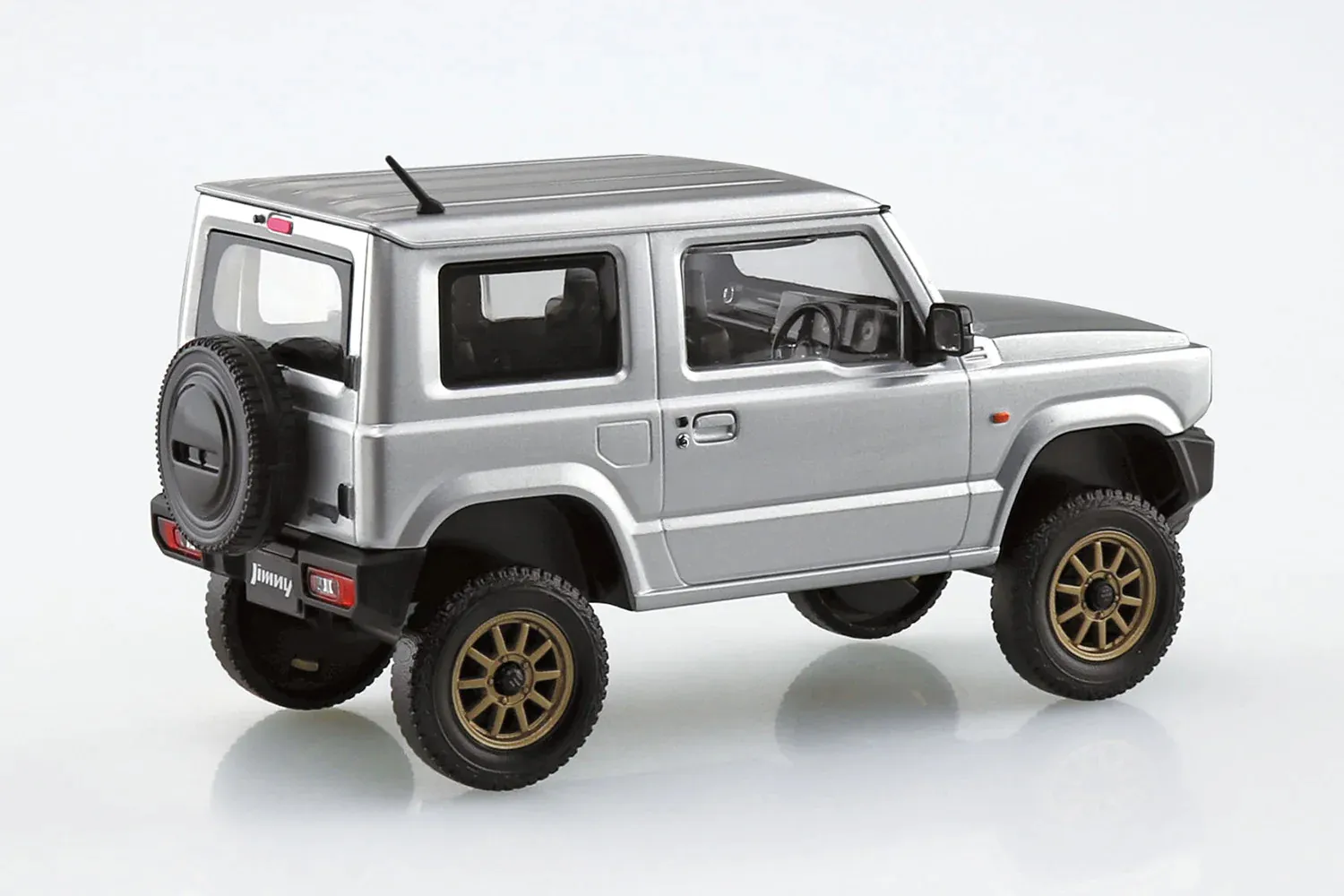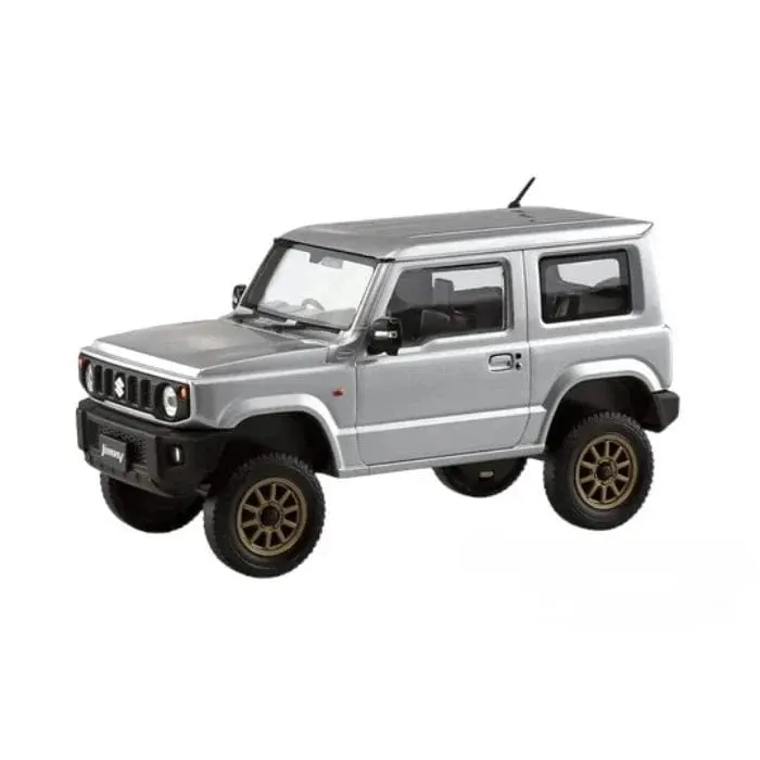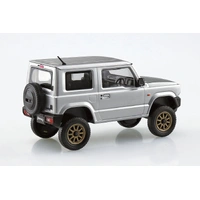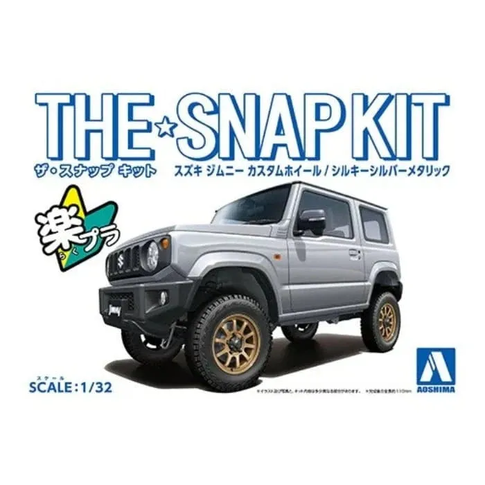 SKU: A006681 | Brand: Aoshima | Product: Aoshima 1/32 Suzuki Jimny Custom Wheel (Silky Silver Metallic) Snap Kit Plastic Model Kit This 1/32 Snap Kit features the Suzuki Jimny with a debut lift-up mechanism for the series, combining inch-up block tyres and custom wheels. Rim and disc surfaces are separate components, allowing customization through colour replacement options. The 35-piece model assembles with or without the lift mechanism. Supplied with new-mould inch-up block tyres and custom wheels. Body finish is Silky Silver Metallic with bronze wheels. Pre-coloured plastic eliminates painting requirements, and snap-fit assembly requires no adhesive. Standard tyres and wheels are not included due to the custom specification. Designated SNAP KIT No.8-SP4.