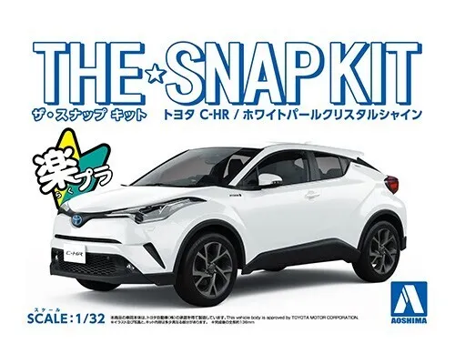 SKU: A005634 | Brand: Aoshima | Product: Aoshima 1/32 Toyota C-HR (White Pearl) This 1/32 scale SNAP model kit reproduces the Toyota C-HR finished in White Pearl. The C-HR is a Japanese subcompact crossover introduced at the 2016 Geneva Motor Show, manufactured in Iwate, Japan and Sakarya, Turkey. Base specifications: 436 cm length, 179.5 cm width, 264 cm wheelbase, curb weight to 1,460 kg. The production vehicle incorporates design elements developed between 2014–2015 and competes with the Nissan Qashqai and Mitsubishi ASX. Available powertrains include petrol engines of 116, 148, and 171 HP, alongside hybrid options producing 122 and 184 HP (with the lower-output hybrid derived from the Prius IV). Initial market launch occurred in Europe, followed by Japan and North America. Assembly required.