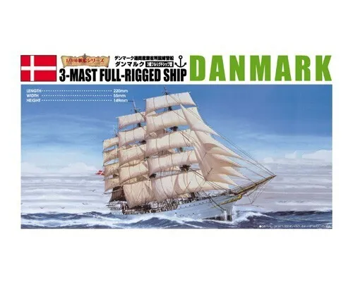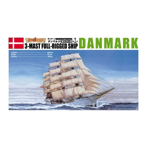 Aoshima's kit of the Danmark features authentic detail throughout, including a two-piece lower hull, vacuformed plastic sails (you have to cut them out), thread for rigging, and a nice display stand.