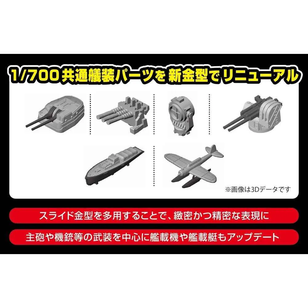 Outfitting parts have been newly researched and redesigned. With extensive use of slide molds, this series faithfully reproduces the intricate detail of 1/700 scale ships. Discover the enhanced precision of the renewed Waterline Series.