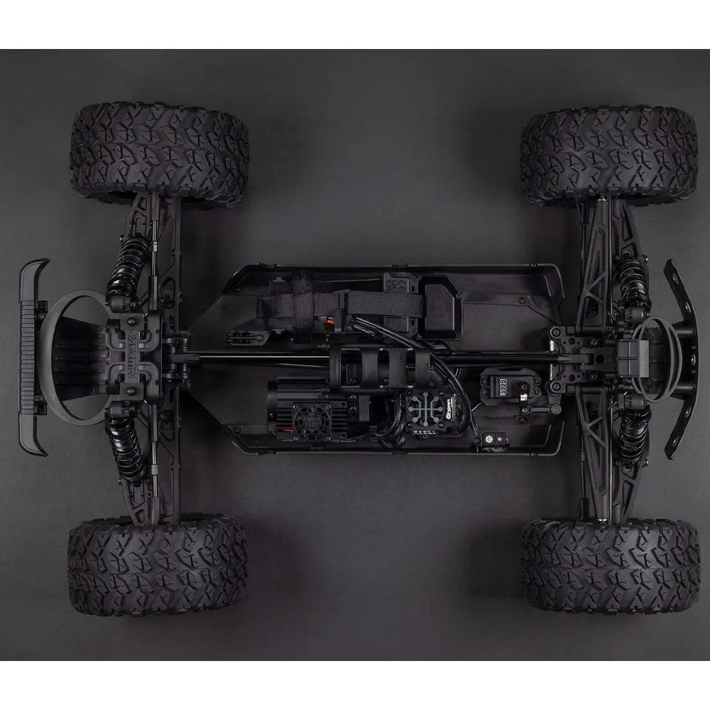 From the reinforced, black-anodized 6061-T6 aluminum chassis to the independent suspension with adjustable, aluminum-bodied, oil-filled shocks, the characteristically durable ARRMA design lets you fearlessly tackle all terrain and all conditions. The metal drivetrain, steel driveshafts, and metal-geared Spektrum S665 digital steering servo all work together to bring out the full bashing potential of 6S brushless power.