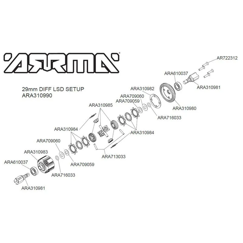 This Front or Rear Limited Slip Spiral Cut Diff Set provides a pre-assembled unit for your ARRMA vehicle Includes 1 x Factory Assembled Limited Slip Front or Rear Diff, 29mm Diff Case, GP4 43T Spiral Cut Gear and 10k cSt Silicone Oil Requires To be used with #ARA310979