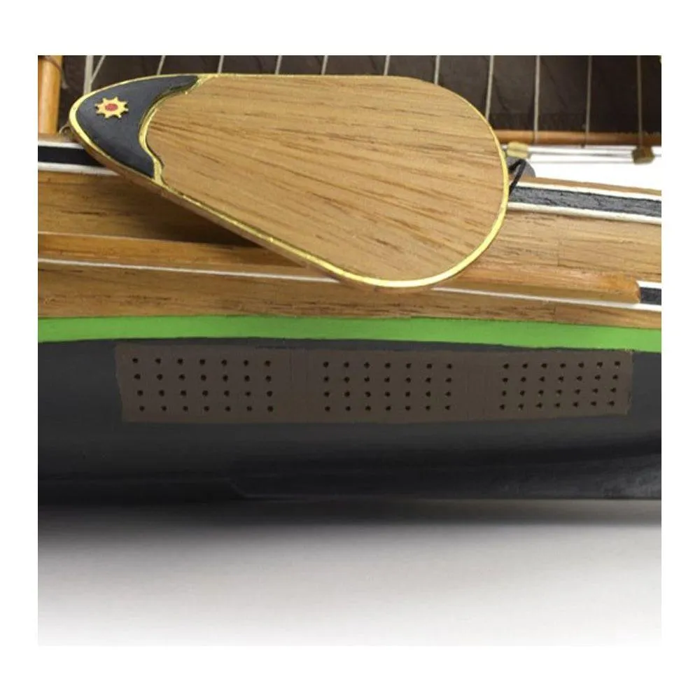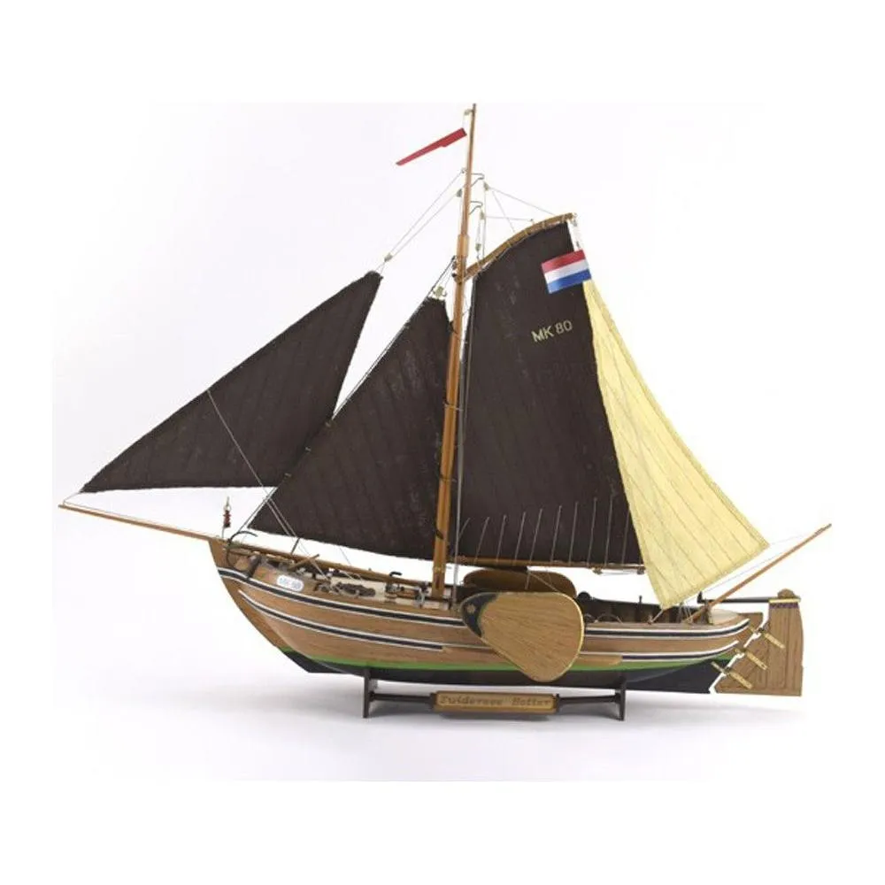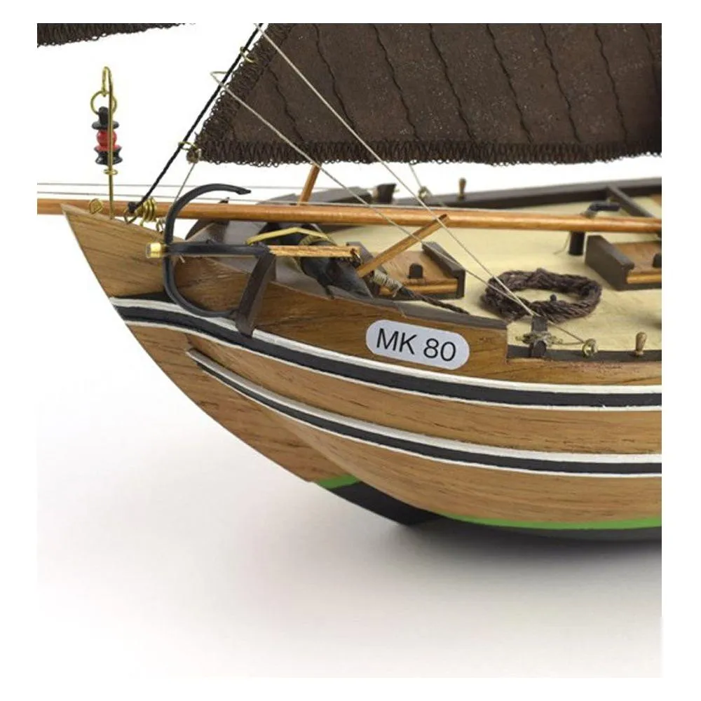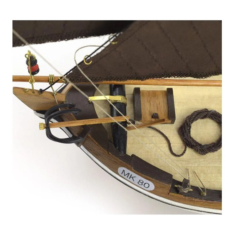 The model ship kit contains high-precision laser-cut board parts, hardwoods, brass, cast iron and hand-sewn cotton sails ready to be placed. In addition, it now includes a bonus: a beautiful wooden exhibition base to build with the name plate of the Botter fishing boat.