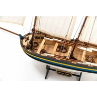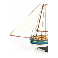 The wooden model kit of the HMS Endeavour captain's boat has high-quality parts for assembly: high precision laser-cut board, noble woods such as birch, hand-sewn sails ready to be placed, cotton threads and metal parts in photo-etched, brass and die-cast.