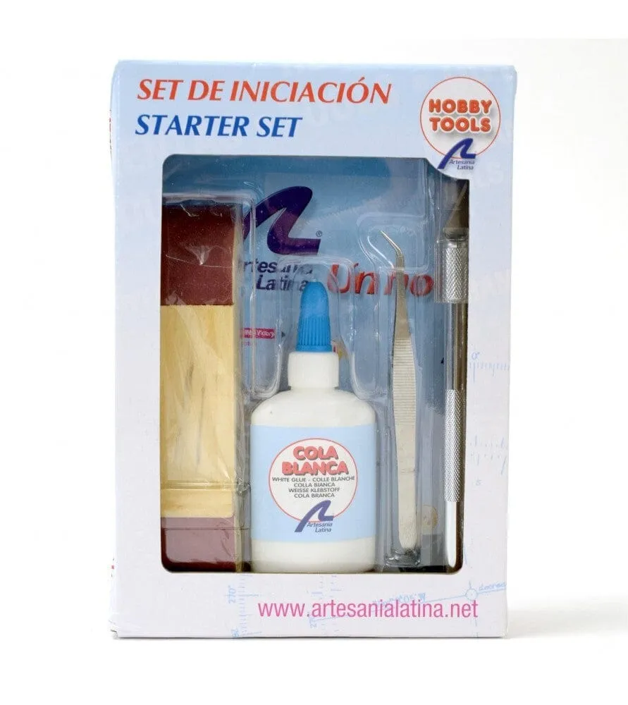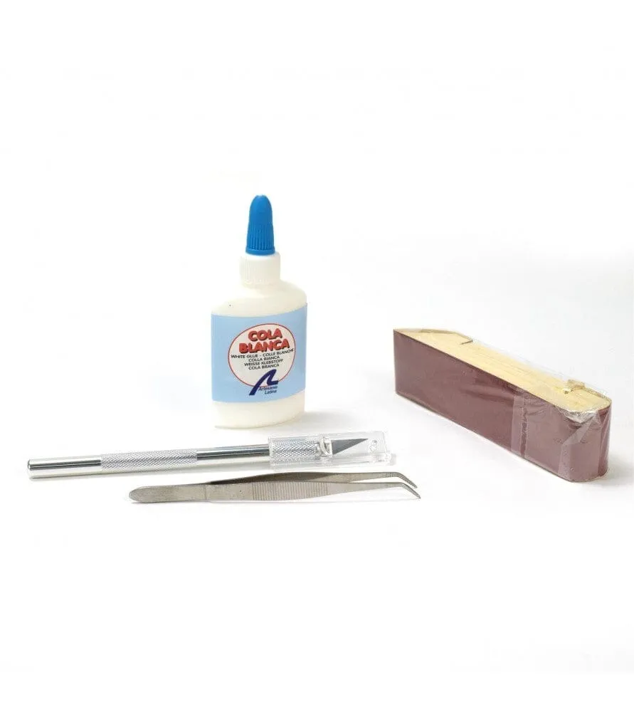 SKU: ART-27005 | Brand: Artesania Latina | Product: Artesania Basic Tool Starter Set Modelling Tool [27005] This foundational toolbox contains essential implements for assembling wooden scale models across naval, aviation, and rail disciplines. The starter set facilitates construction of ship models at any scale and suits general craft applications. Contents: - Modeling Cutter: Multi-purpose cutting tool - Curved Tweezers: Precise handling of small components - White Glue: Adhesive for porous materials including wood, paperboard, paper, and cork - Sander Dowel: Support block for sandpaper work