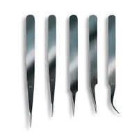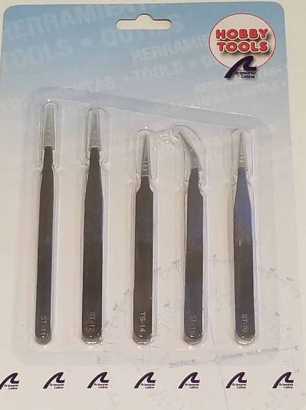 SKU: ART-27068 | Brand: Artesania Latina | Product: Artesania Tweezer Set Fine Stainless (5) Modelling Tool [27068] Five-piece stainless steel tweezer collection for precision component placement and assembly. Includes four straight tweezers in varying lengths and tip configurations, plus one angled tweezer for detailed work. Fine-pointed design enables access to confined spaces during model construction.