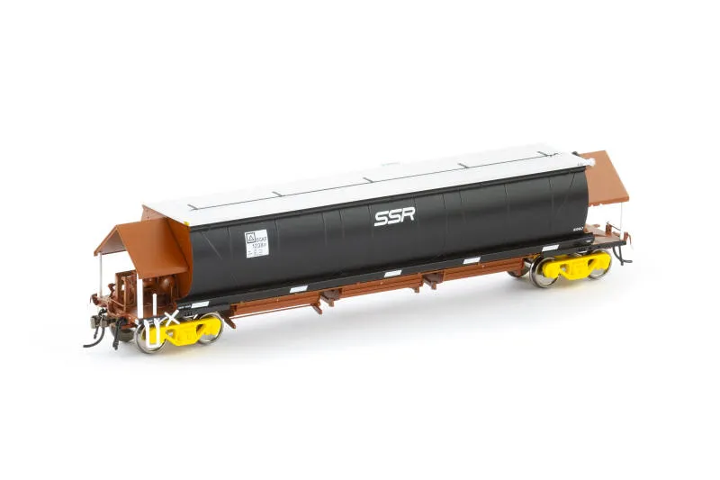 Auscision Models HO BGKF Grain Hopper, Black/Faded SRA Red with SSR Logos, Grain Lids & Yellow XCS Bogies - 4 Wagon Pack