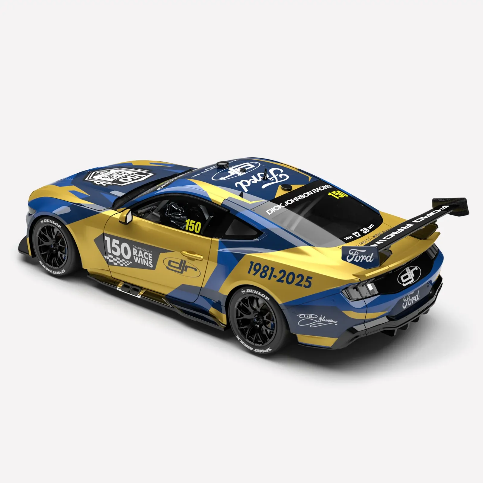 The design incorporates DJR and Ford branding, along with special ‘150’ race numbers and markings on the doors and bonnet to commemorate the milestone. Additional details honour both Johnson and Kostecki/Hazelwood as the 1st and 150th race-winning drivers, with their respective race numbers on the lower rear windscreen and highlights across the boot lid.