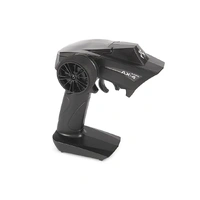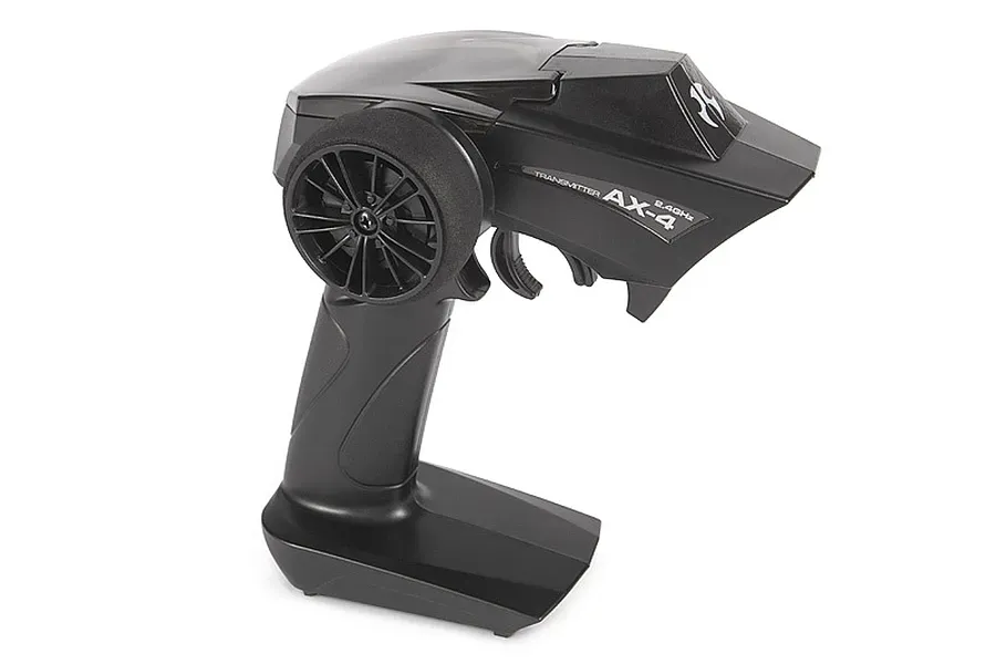 The AX-4 transmitter features a throttle trim knob for low, medium, and high speed setting, a switch for steering servo reversing, steering dual rate, a switch for third channel applications (aux port on the ESC), steering trim, battery level indicator, a bind button, and on/off switch.